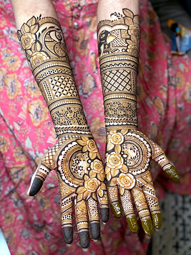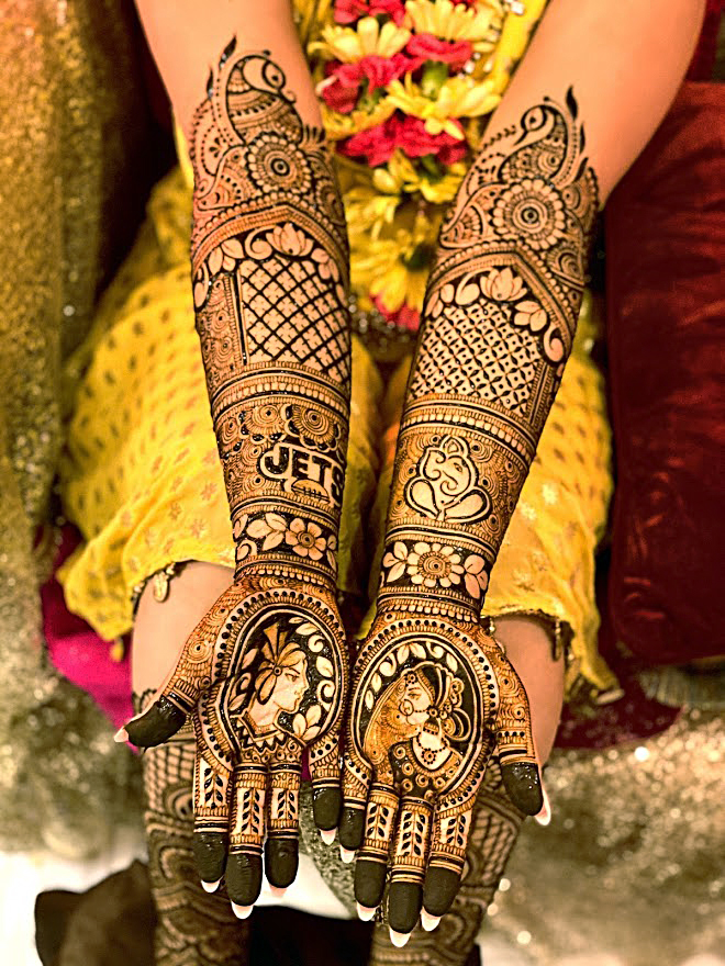 This selection includes intricate henna on palms extending halfway up between wrist and elbows wrapping around with same style and intricacy on the back side of hands. Designs can be customized with bride groom figurines, unique patterns and personal touches.