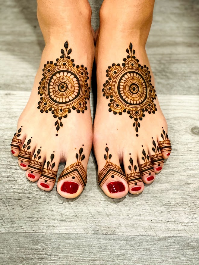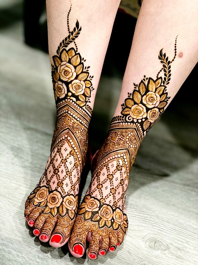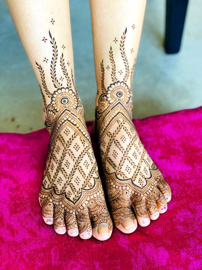 This package includes intricate henna on the tops of feet that extends to the ankles.