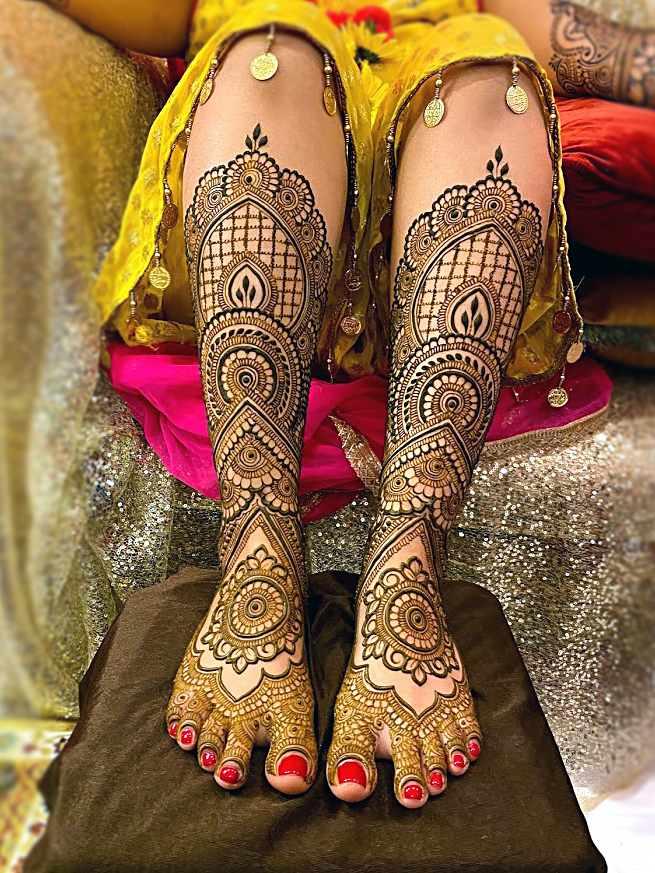 This package includes intricate henna on the tops of feet that extends to the mid-calf. Design will cover tops of feet and front of legs up to the mid-calf.