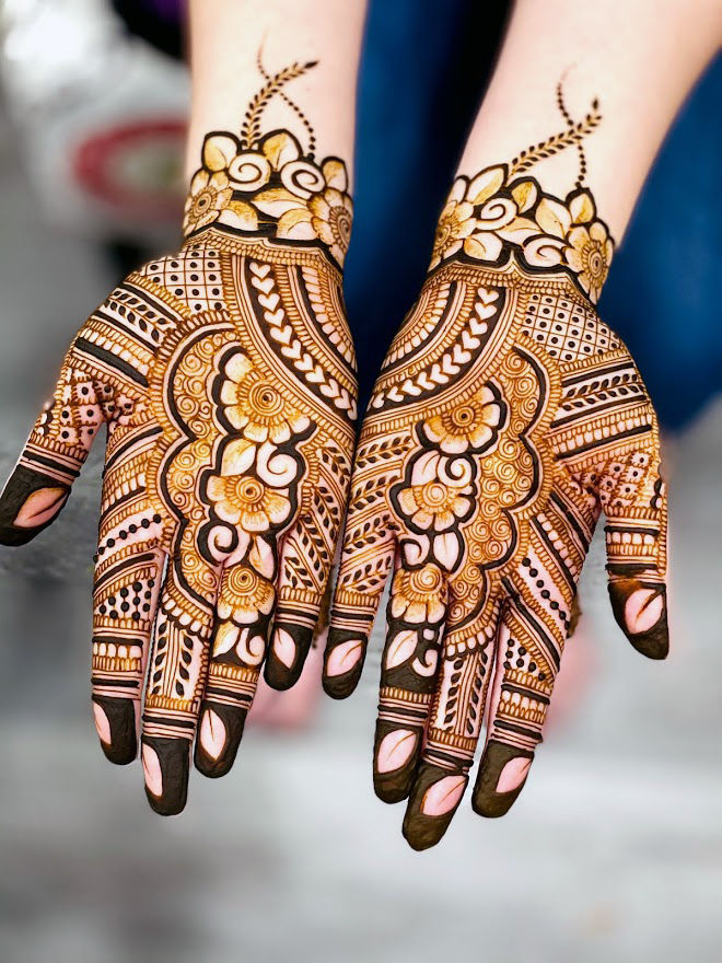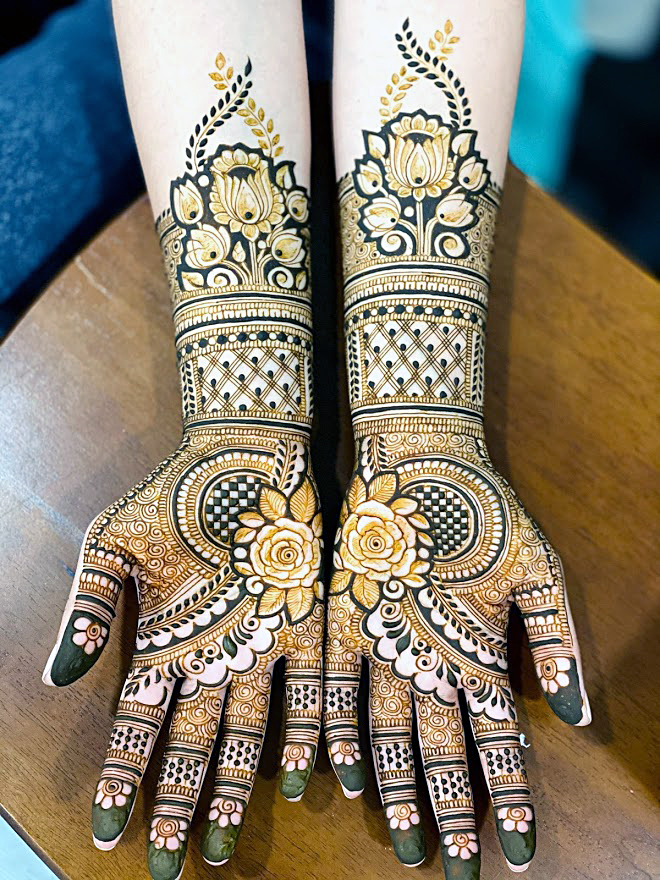 Full pampering! This selection is for the brides who wants to go all out with intricate traditional maharani style henna includes detailed henna on palms extending above the elbows wrapping around with same style and intricacy on the back side of hands. Designs can be customized with bride groom figurines, unique patterns and personal touches.